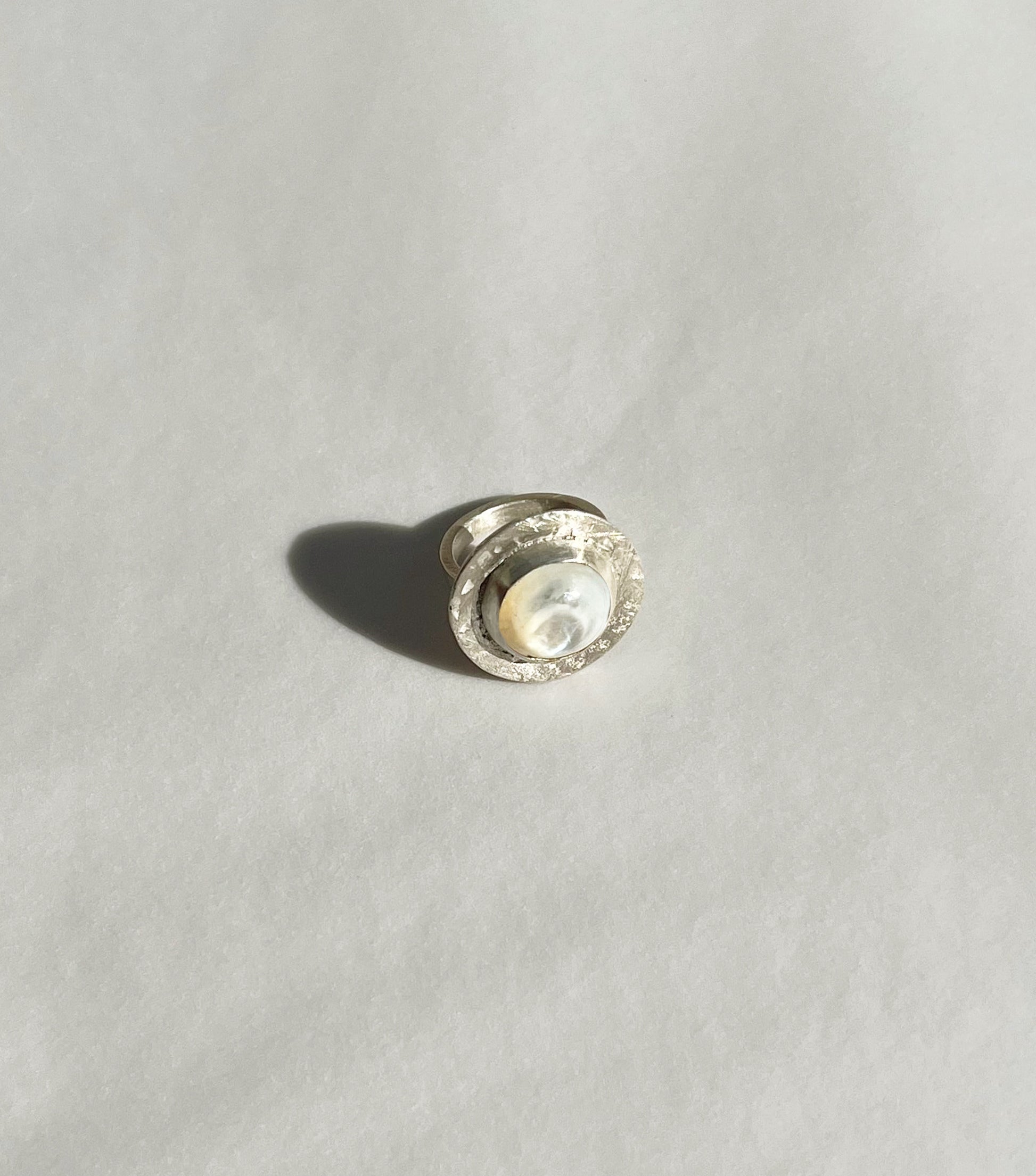 Hammered and heated silver plate with a precious mother-of-pearl cabochon satin finish ring.
